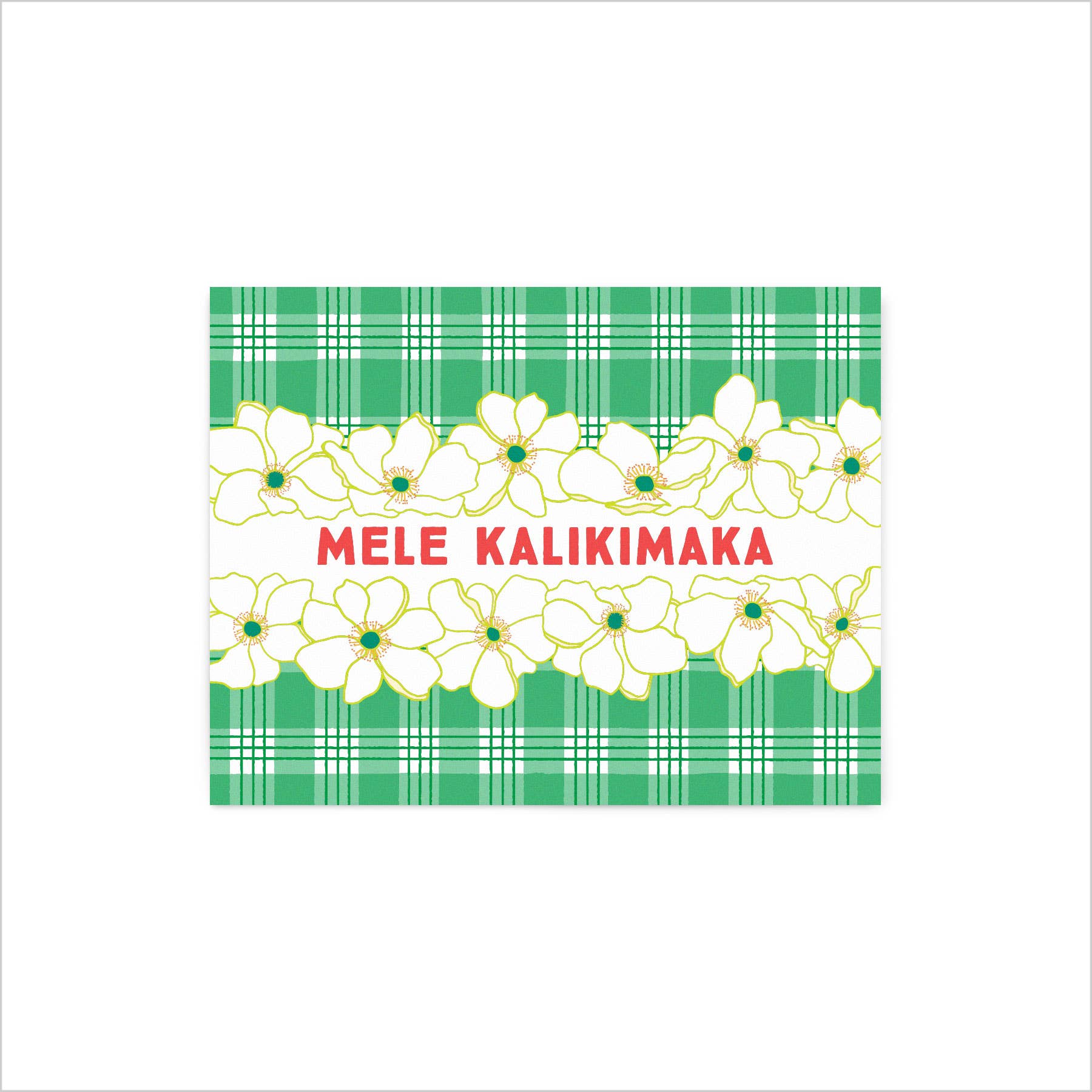 Mele Kallikimaka! Modern aloha meets traditional Hawaii with this palaka and floral print card that celebrates the Christmas season.